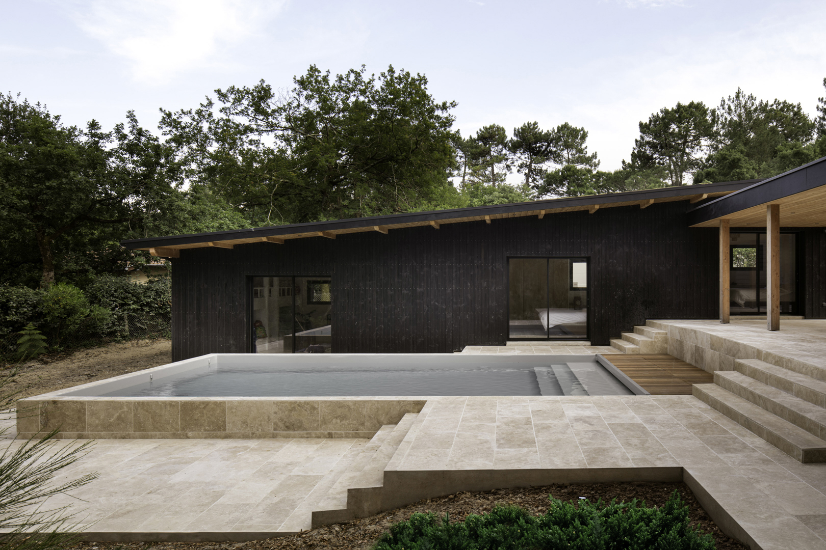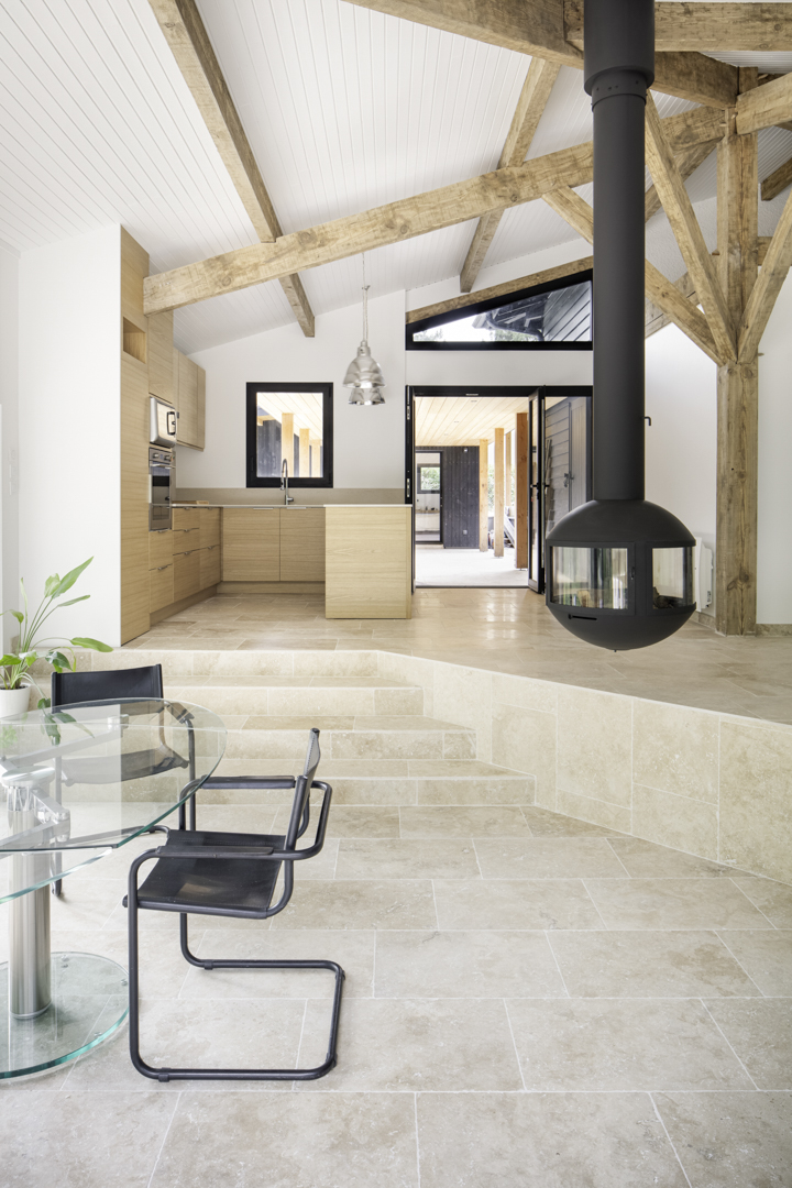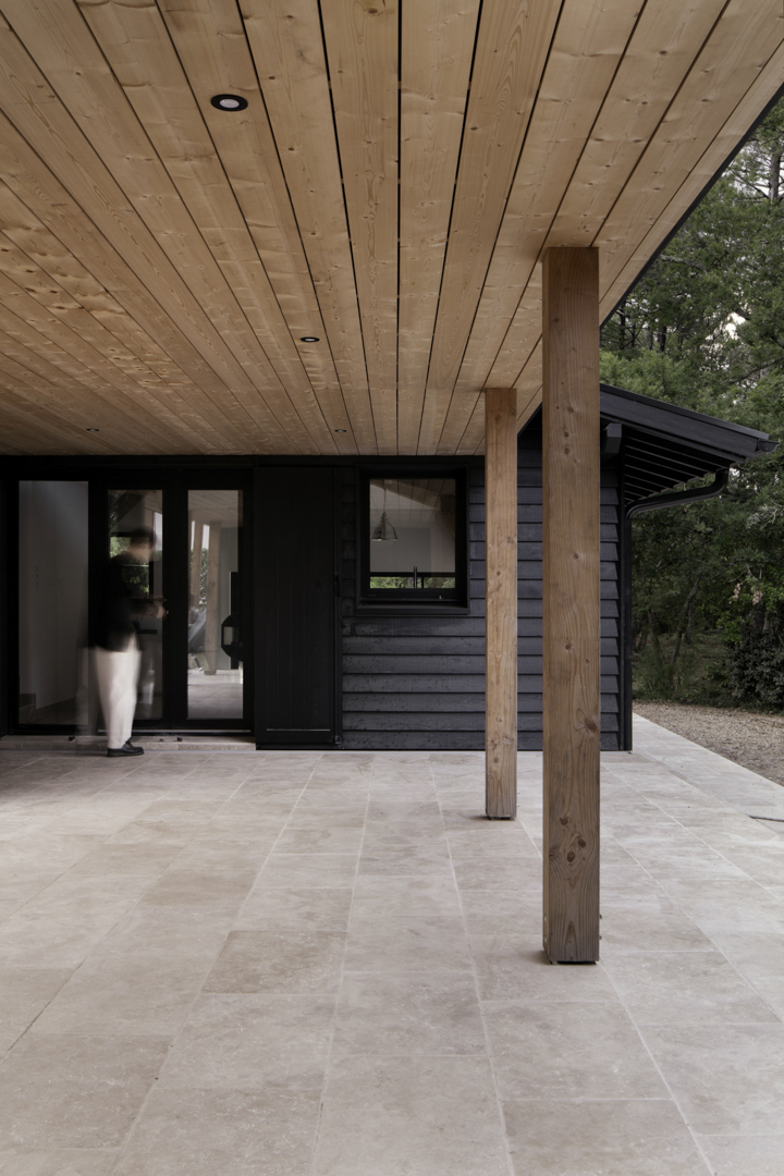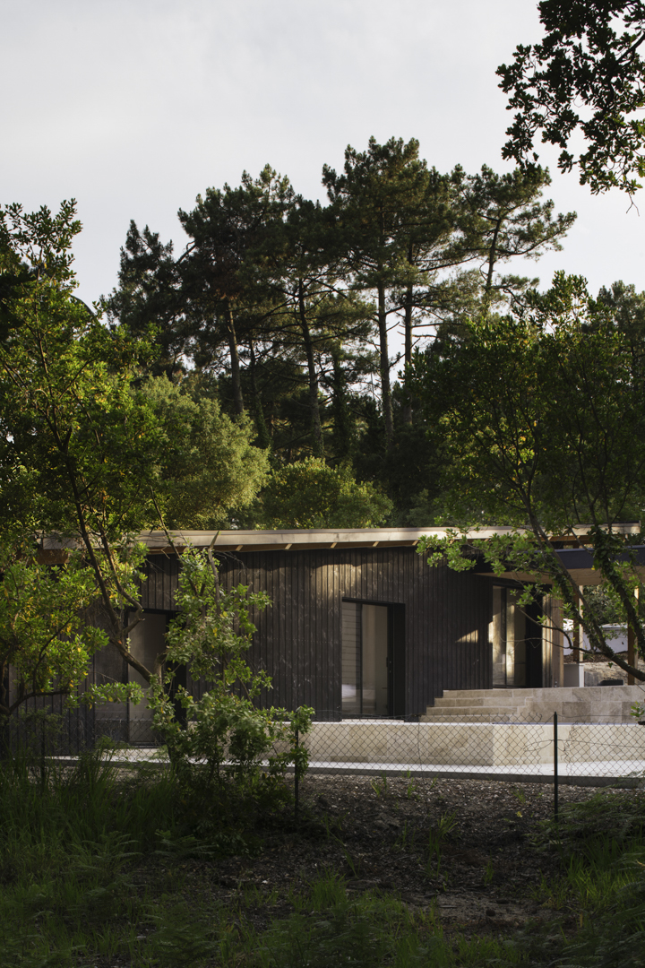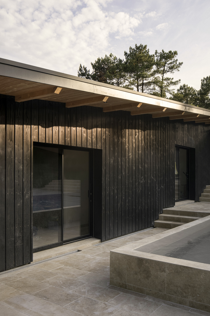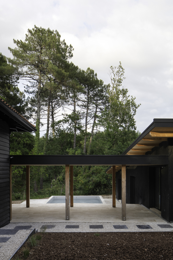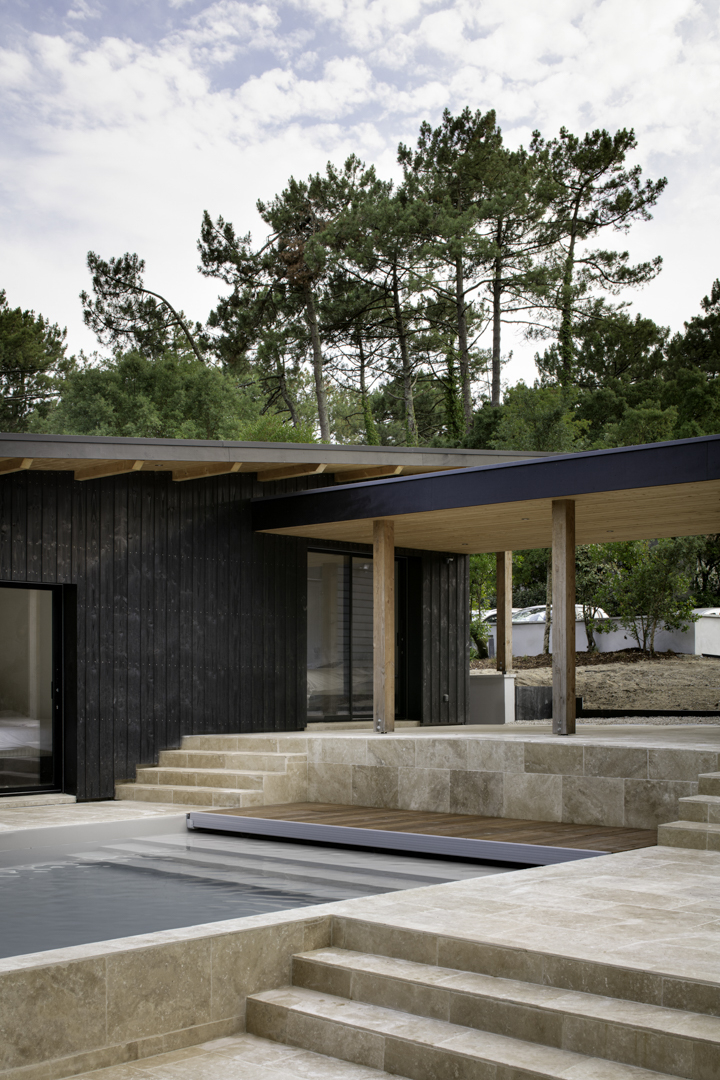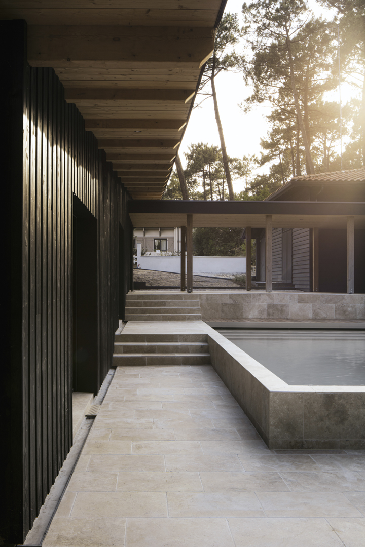 Site : Le Penon, Quartier d’habitation en lisiere de Pinede bordant la cote landaise Programme : Renovation totale de maison et construction d’une annexe ossature bois (RE 2020) avec terrasses et piscine Matériaux : Pin, Sapin, Chene, Pierre naturelle de travertin, Aluminium Date : Realisation en 2023