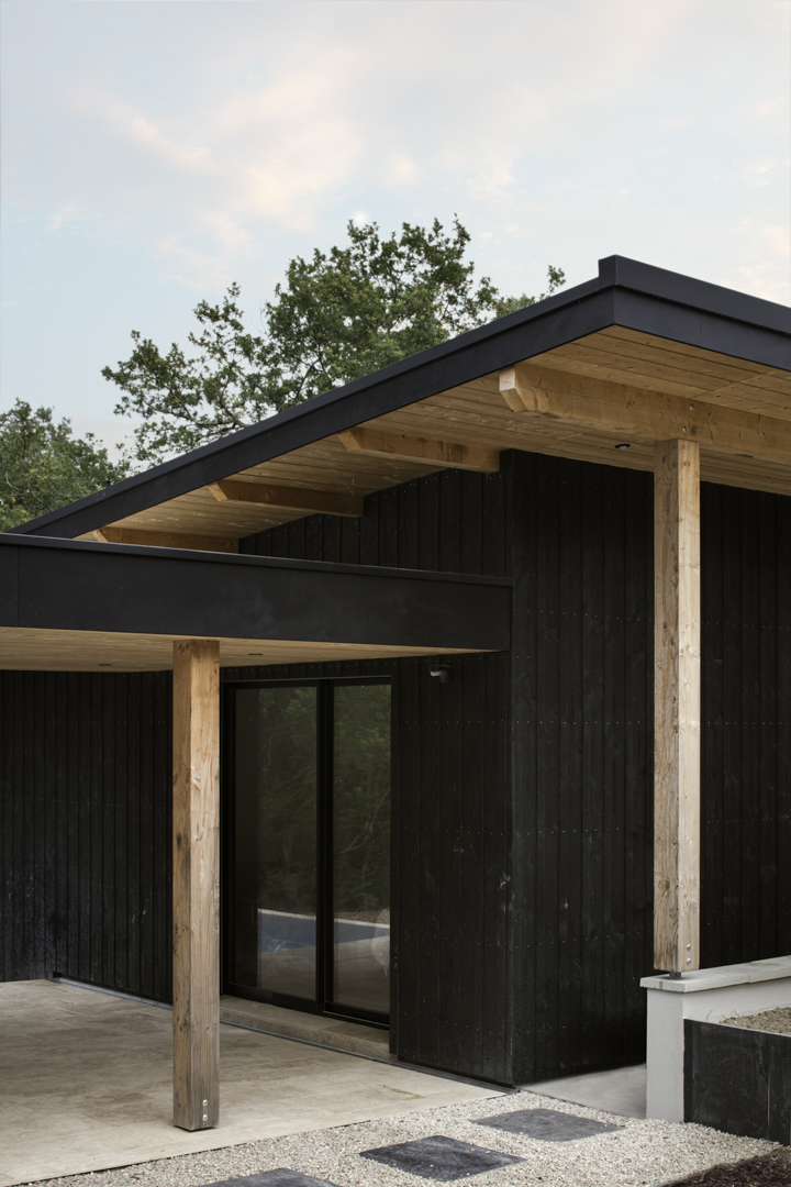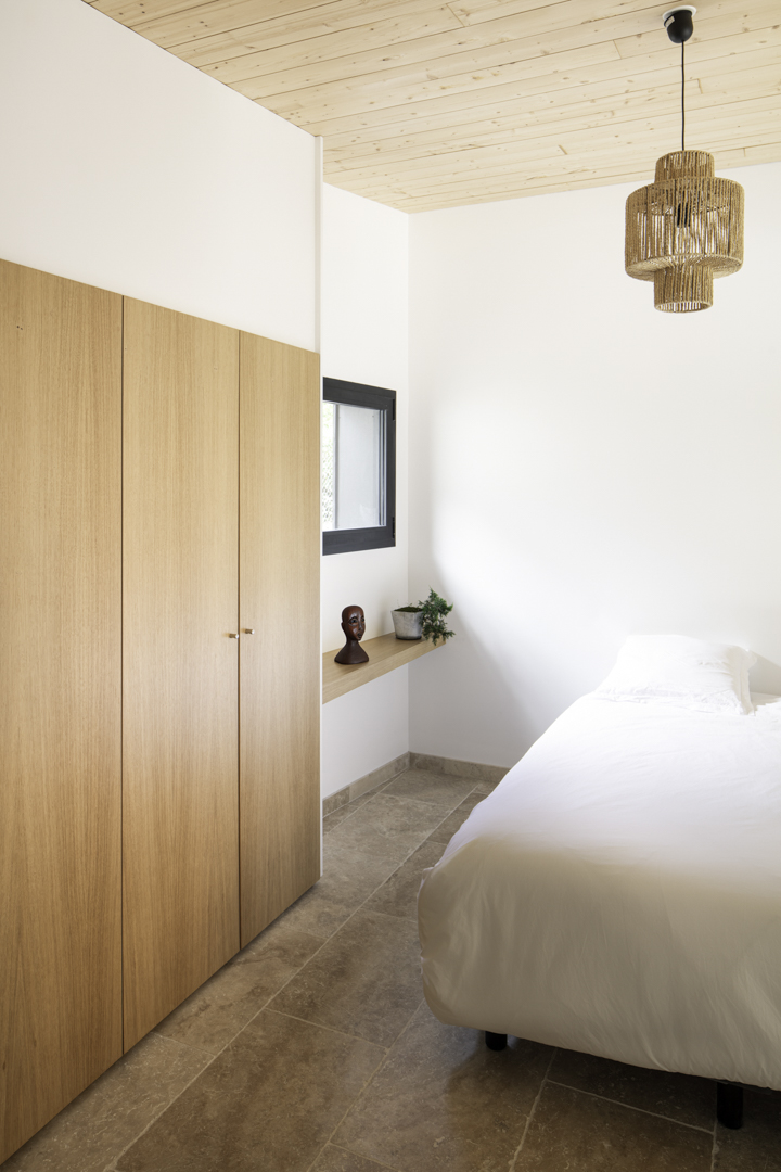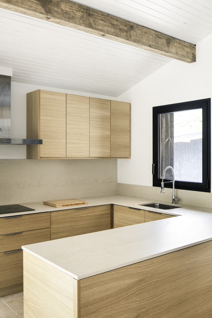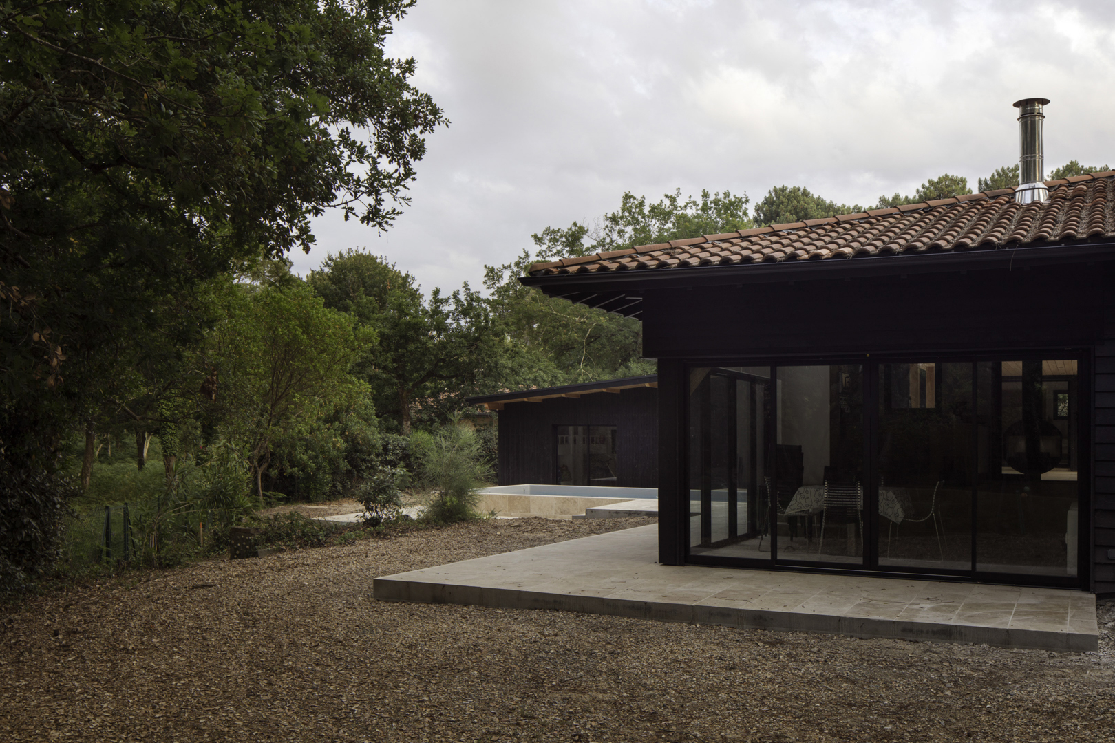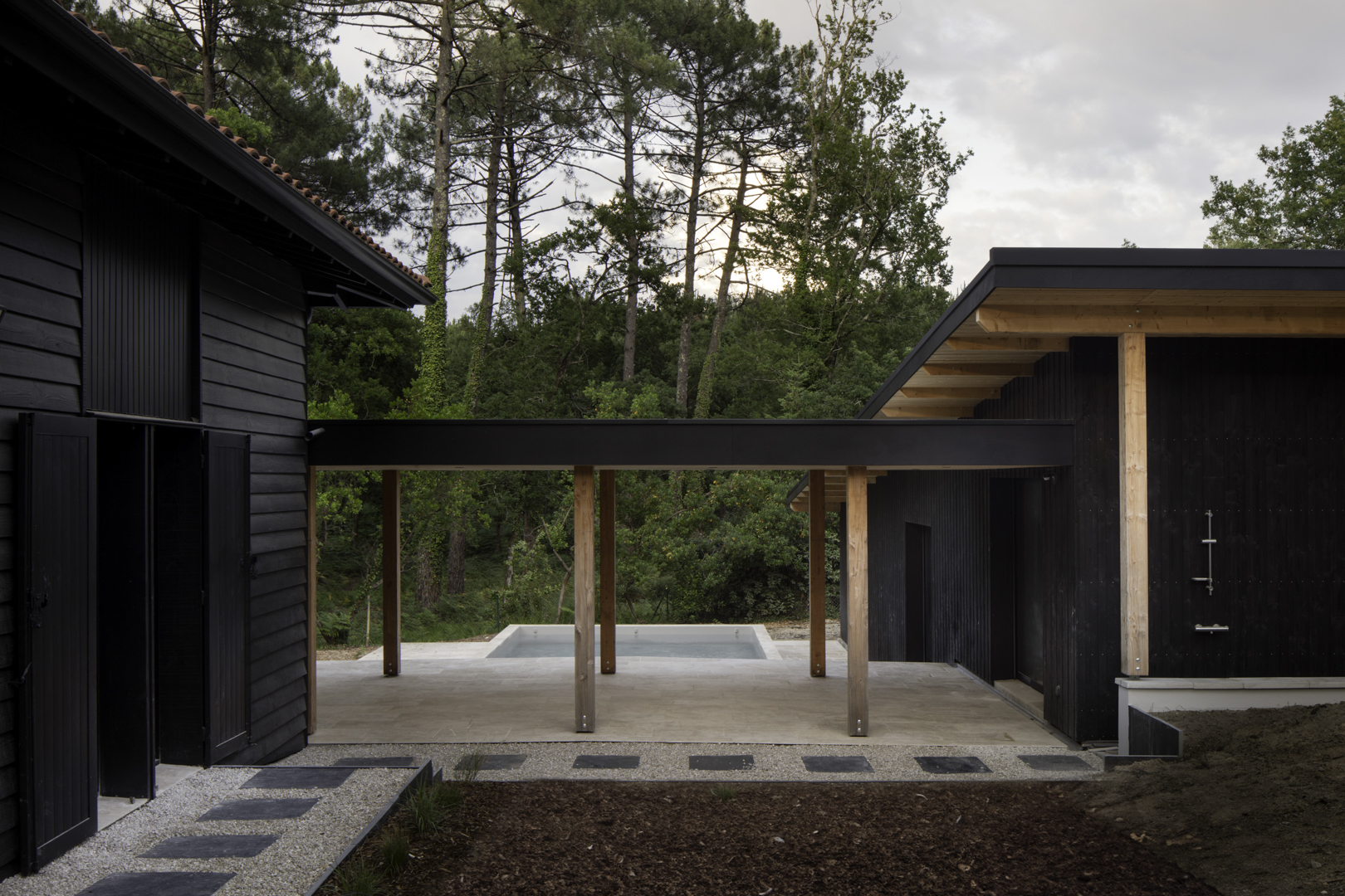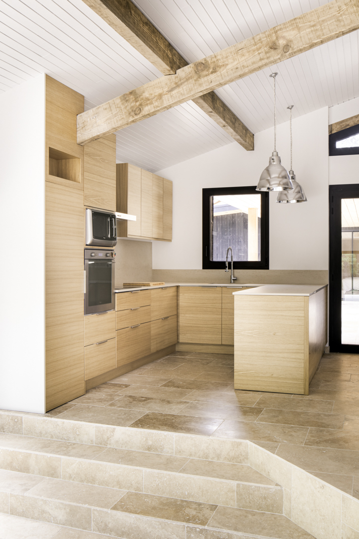 Site : Le Penon, Quartier d’habitation en lisiere de Pinede bordant la cote landaise Programme : Renovation totale de maison et construction d’une annexe ossature bois (RE 2020) avec terrasses et piscine Matériaux : Pin, Sapin, Chene, Pierre naturelle de travertin, Aluminium Date : Realisation en 2023
